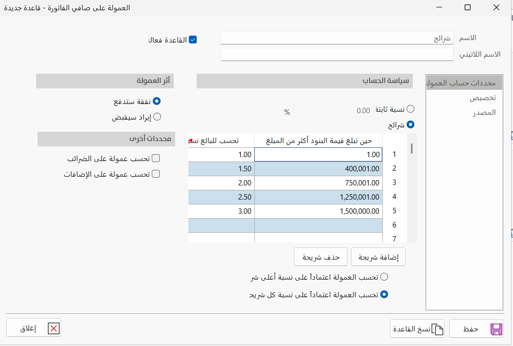 اتاحة حساب العمولة بناء علي حالة الفاتورة والسداد الخاص فمثلا اذا كانت الفاتورة سدد منها نسبة 30% يتم احتساب فقط نسبة معينه من العمولة وهكذا وهيا قواعد يتم تعريفها مثل تعريف شرائح ونسب حساب العمولة وايضا اتاحة تحديد الفواتير اللتي يتم احتساب العمولة لها